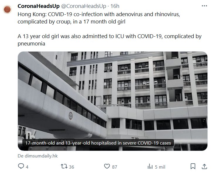 Hong Kong: Coinfección por COVID-19 con adenovirus y rinovirus, complicada con crup, en una niña de 17 meses. Una niña de 13 años también ingresó en la UCI con COVID-19, complicada con neumonía.
