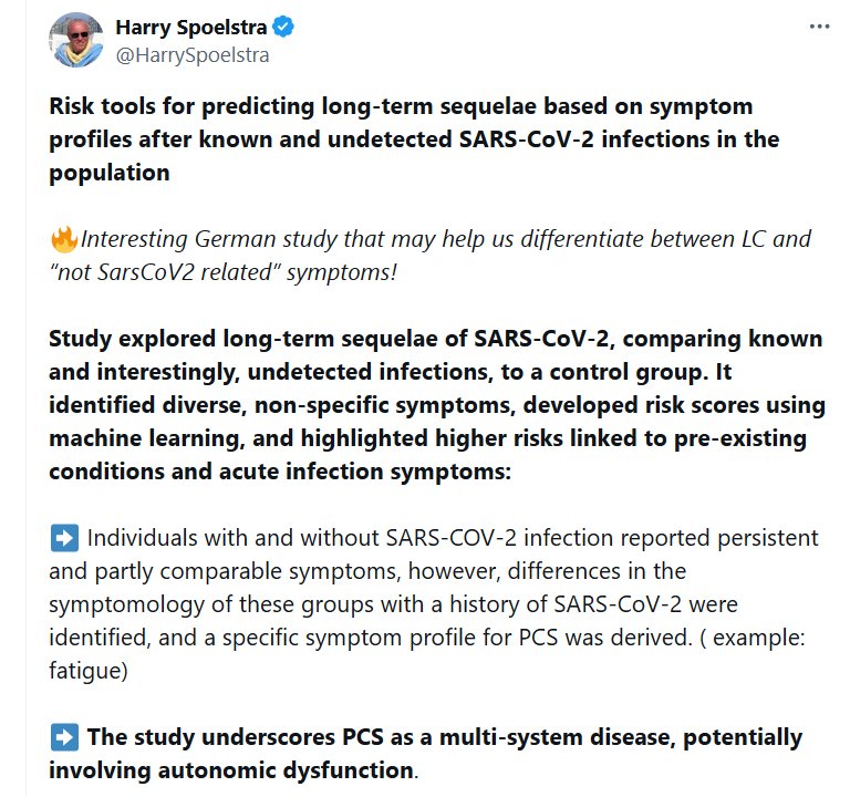 DR. Harry Spoelstra @HarrySpoelstra Herramientas de riesgo para predecir secuelas a largo plazo basadas en perfiles de síntomas tras infecciones por SARS-CoV-2 conocidas y no detectadas en la población. 🔥¡Interesante estudio alemán que podría ayudarnos a diferenciar entre el CP y los síntomas no relacionados con el SARS-CoV-2!