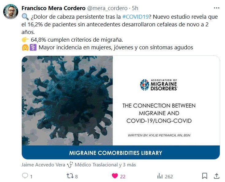 Francisco Mera Cordero @mera_cordero · 5h 🔍 ¿Dolor de cabeza persistente tras la #COVID19? Nuevo estudio revela que el 16,2% de pacientes sin antecedentes desarrollaron cefaleas de NUEVO a 2 años. 👉 64,8% cumplen criterios de migraña. 👩⚕️ Mayor incidencia en mujeres, jóvenes y con síntomas agudos