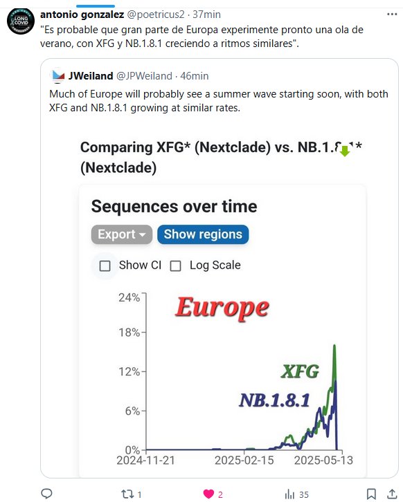 6º AÑO DE «FIN DE PANDEMIA» «Es probable que gran parte de Europa experimente pronto una ola de verano, con XFG y NB.1.8.1 creciendo a ritmos similares» Posted on mayo 24, 2025 por coronado