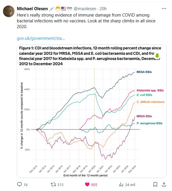 COVID=SIDA Aquí hay evidencia contundente de daño inmunitario causado por la COVID-19 en infecciones bacterianas sin vacunas. Observe los fuertes aumentos desde 2020. Posted on mayo 24, 2025 por coronado