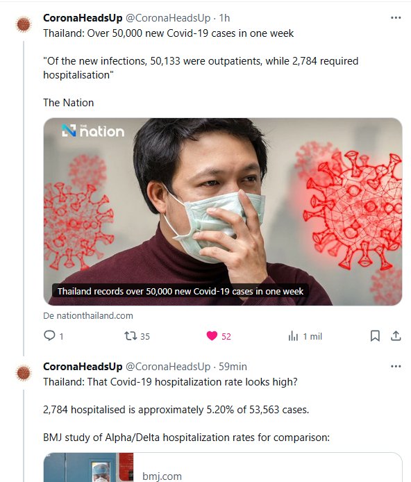 Tailandia: ¿Esa tasa de hospitalización por COVID-19 parece alta? 2784 hospitalizados representan aproximadamente el 5,20 % de 53 563 casos. Estudio de BMJ sobre las tasas de hospitalización de las variantes Alfa/Delta para comparación.