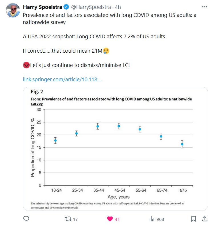 Dr. Harry Spoelstra @HarrySpoelstra Prevalencia y factores asociados con la COVID persistente entre adultos Encuesta nacional EEUU 2022 La COVID persistente afecta al 7,2 % de los adultos estadounidenses. Si es correcto… ¡podría significar 21 millones! 😢 😡¡Sigamos ignorando/minimizando la COVID persistente!
