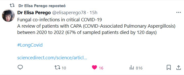 Dra. Elisa Perego @elisaperego78 Coinfecciones fúngicas en casos críticos de COVID-19 Revisión de pacientes con CAPA (Aspergilosis Pulmonar Asociada a COVID) entre 2020 y 2022 (el 67 % de los pacientes muestreados falleció antes de los 120 días)