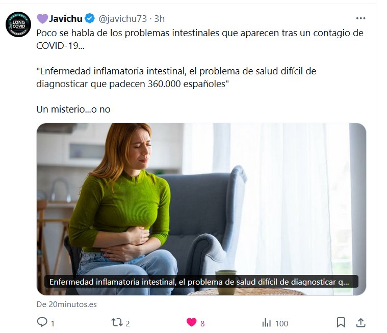 NO NOS QUEDA MÁS QUE LA IRONÍA 💜Javichu @javichu73 · Poco se habla de los problemas intestinales que aparecen tras un contagio de COVID-19… «Enfermedad inflamatoria intestinal, el problema de salud difícil de diagnosticar que padecen 360.000 españoles» Un misterio…o no