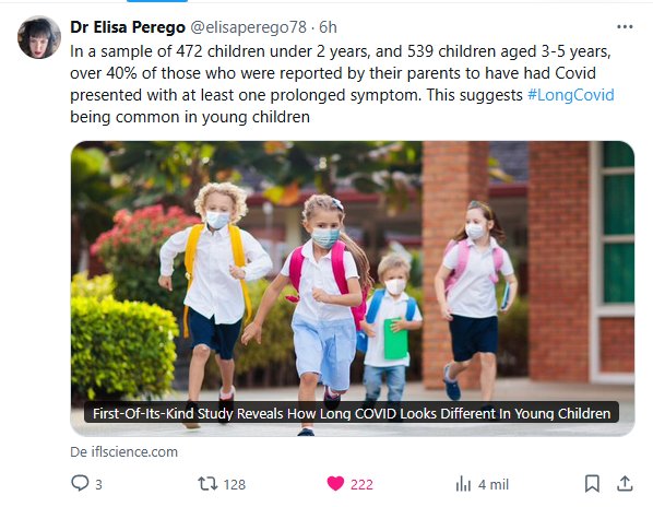 Dra. Elisa Perego @elisaperego78 En una muestra de 472 niños menores de 2 años y 539 niños de 3 a 5 años, más del 40 % de los que, según informaron sus padres, habían tenido Covid presentaron al menos un síntoma prolongado. Esto sugiere que la #CovidProlongada es común en niños pequeños.