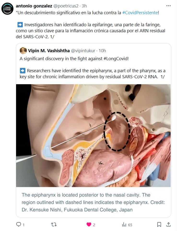«Un descubrimiento significativo en la lucha contra la #CovidPersistente! ➡️ Investigadores han identificado la epifaringe, una parte de la faringe, como un sitio clave para la inflamación crónica causada por el ARN residual del SARS-CoV-2