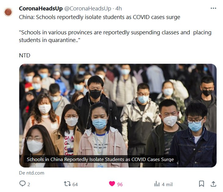 China: Según informes, las escuelas aíslan a los estudiantes ante el aumento de casos de COVID. Según informes, las escuelas de varias provincias están suspendiendo las clases y poniendo a los estudiantes en cuarentena.