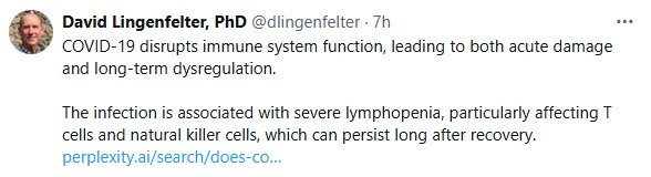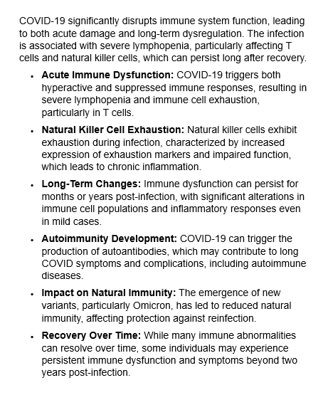 David Lingenfelter, PhD @dlingenfelter La COVID-19 altera la función del sistema inmunitario, lo que provoca daño agudo y desregulación a largo plazo. La infección se asocia con una linfopenia grave, que afecta especialmente a los linfocitos T y a las células asesinas naturales (NK), y que puede persistir mucho tiempo después de la recuperación.
