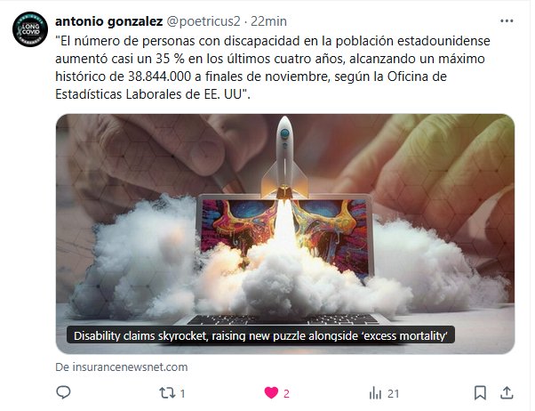 «El número de personas con discapacidad en la población estadounidense aumentó casi un 35 % en los últimos cuatro años, alcanzando un máximo histórico de 38.844.000 a finales de noviembre, según la Oficina de Estadísticas Laborales de EE. UU».