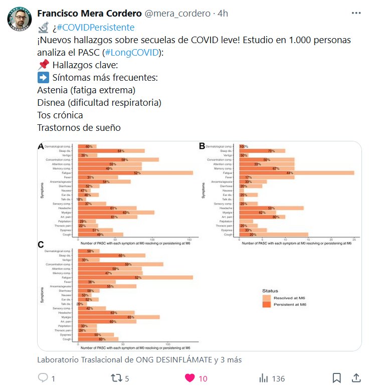 Francisco Mera Cordero @mera_cordero · 🔬 ¿#COVIDPersistente ¡Nuevos hallazgos sobre secuelas de COVID leve! Estudio en 1.000 personas analiza el PASC (#LongCOVID): 📌 Hallazgos clave: ➡️ Síntomas más frecuentes: Astenia (fatiga extrema) Disnea (dificultad respiratoria) Tos crónica Trastornos de sueño