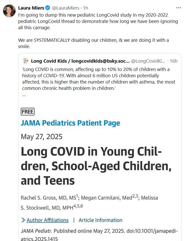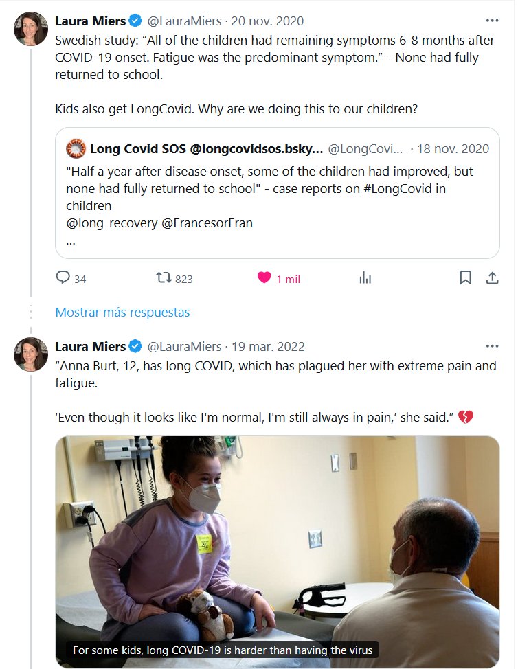 Laura Miers @LauraMiers Estudio sueco del 20 de noviembre de 2020: “Todos los niños presentaban síntomas persistentes entre 6 y 8 meses después del inicio de la COVID-19. La fatiga fue el síntoma predominante”. Ninguno había regresado completamente a la escuela. Los niños también contraen la COVID-19 prolongada. ¿Por qué les hacemos esto a nuestros hijos?