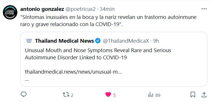 «Síntomas inusuales en la boca y la nariz revelan un trastorno autoinmune raro y grave relacionado con la COVID-19» Posted on junio 3, 2025 por coronado https://x.com/ThailandMedicaX/status/1929728494545916241 https://www.thailandmedical.news/news/unusual-mouth-and-nose-symptoms-reveal-rare-and-serious-autoimmune-disorder-linked-to-covid-19