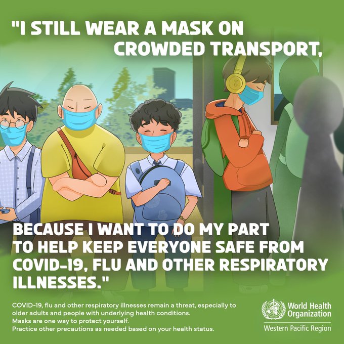 Los casos de COVID-19 están aumentando en todo el mundo, incluso en el Pacífico Occidental. Tenga cuidado y use mascarilla en transporte público. Ayude a protegerse y a proteger a todos del #COVID19, la gripe y otras enfermedades respiratorias. #Cuídese