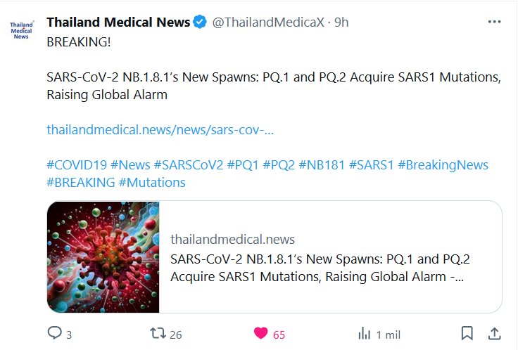 Thailand Medical News @ThailandMedicaX ¡ÚLTIMA HORA! Nuevos engendros del SARS-CoV-2 NB.1.8.1: PQ.1 y PQ.2 adquieren mutaciones del SARS1, lo que genera alarma mundial Posted on junio 4, 2025 por coronado https://www.thailandmedical.news/news/sars-cov-2-nb-1-8-1-s-new-spawns-pq-1-and-pq-2-acquire-sars1-mutations-raising-global-alarm
