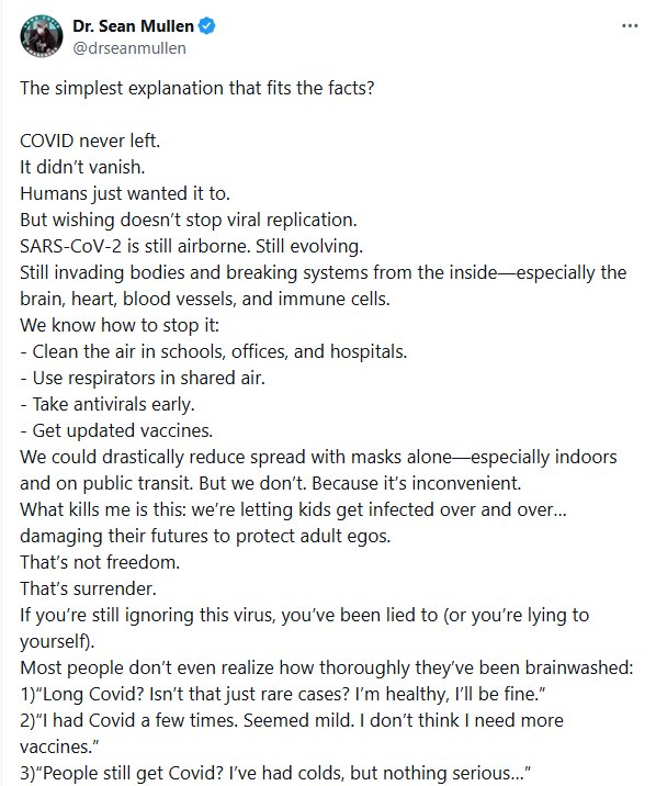 Sabemos cómo detenerlo: - Limpiar el aire en escuelas, oficinas y hospitales. - Utilizar respiradores en aire compartido. - Tome antivirales a tiempo. - Mantenerse actualizado con las vacunas. Podríamos reducir drásticamente la propagación solo con mascarillas, especialmente en espacios cerrados y en el transporte público. Pero no lo hacemos. Porque es incómodo. Lo que me mata es esto: estamos permitiendo que los niños se infecten una y otra vez... dañando su futuro para proteger los egos de los adultos. Eso no es libertad. Eso es rendición. Si todavía ignoras este virus, te han mentido (o te estás mintiendo a ti mismo). La mayoría de las personas ni siquiera se dan cuenta de lo profundamente que les han lavado el cerebro: 1) "¿Covid persistente? ¿No son solo casos raros? Estoy sano, estaré bien". 2) “Tuve COVID varias veces. Parecía leve. No creo que necesite más vacunas.” 3) "¿La gente todavía se contagia de COVID? He tenido resfriados, pero nada grave..." Eso no es claridad. Eso es condicionamiento. Estamos normalizando la discapacidad masiva. No es solo imprudente, es perverso. Si no eres parte de la solución, eres cómplice del daño. Y no, no lo digo a la ligera.