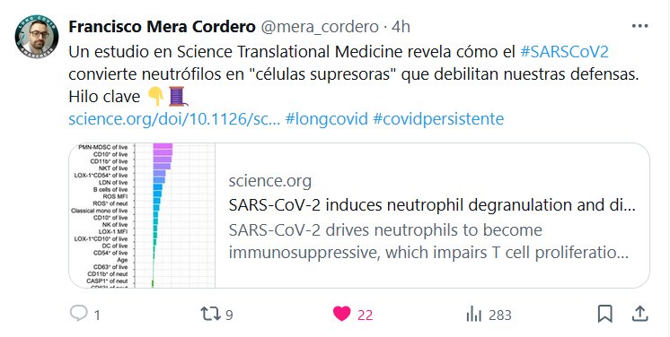 Francisco Mera Cordero @mera_cordero · Un estudio en Science Translational Medicine revela cómo el #SARSCoV2 convierte neutrófilos en «células supresoras» que debilitan nuestras defensas. Hilo clave 👇🧵