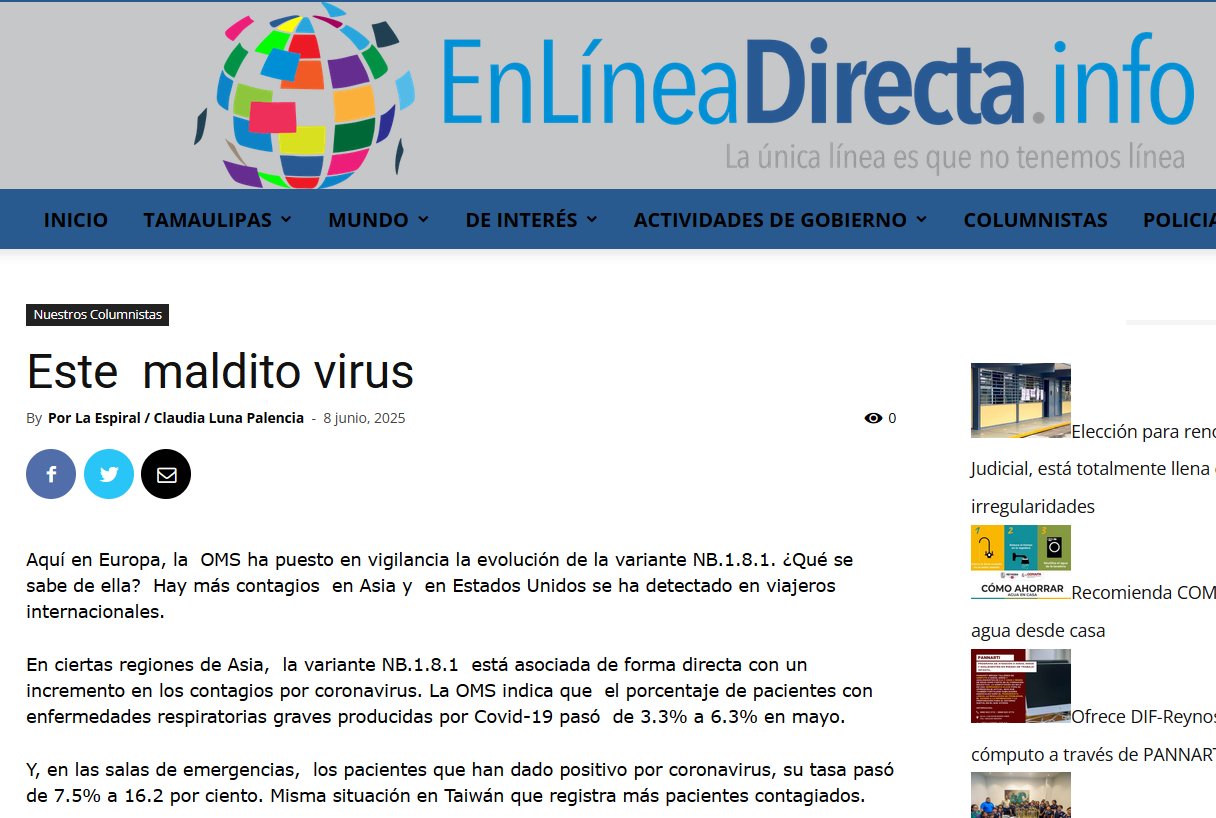 ESTE MALDITO VIRUS La OMS indica que el porcentaje de pacientes con enfermedades respiratorias graves producidas por Covid-19 pasó de 3.3% a 6.3% en mayo. Y, en las salas de emergencias, los pacientes que han dado positivo por coronavirus, su tasa pasó de 7.5% a 16.2 por ciento. Misma situación en Taiwán que registra más pacientes contagiados.