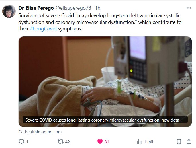 Dra. Elisa Perego @elisaperego78 Los sobrevivientes de Covid grave pueden desarrollar disfunción sistólica ventricular izquierda y disfunción microvascular coronaria a largo plazo, lo que contribuye a sus síntomas de #CovidProlongado.