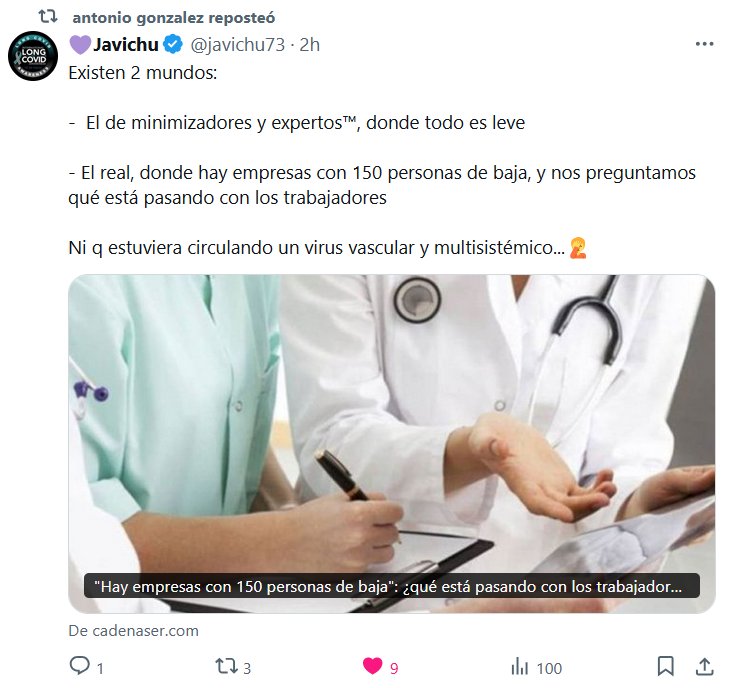 NODIGAMOSCOVID HACE ESTRAGOS Prof. Antonio González reposteó 💜Javichu @javichu73 · Existen 2 mundos: – El de minimizadores y expertos™, donde todo es leve – El real, donde hay empresas con 150 personas de baja, y nos preguntamos qué está pasando con los trabajadores Ni q estuviera circulando un virus vascular y multisistémico…🤦