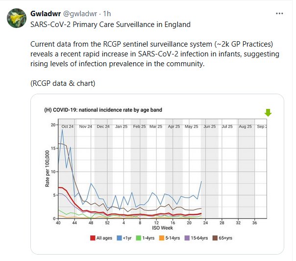 Vigilancia de Atención Primaria del SARS-CoV-2 en Inglaterra Los datos actuales del sistema de vigilancia centinela del RCGP (aproximadamente 2.000 consultorios de medicina general) revelan un rápido aumento reciente de la infección por SARS-CoV-2 en lactantes, lo que sugiere un aumento en la prevalencia de la infección en la comunidad. (Datos y gráfico del RCGP)