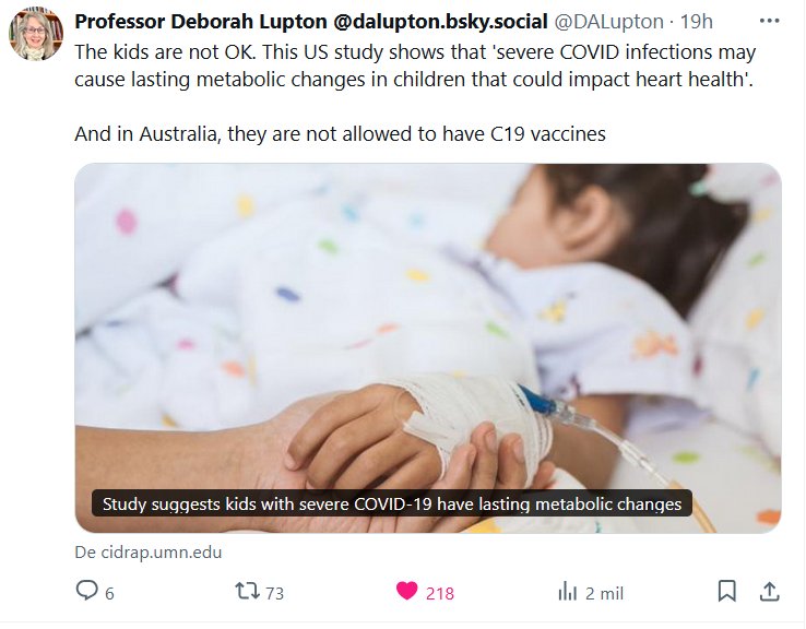 Profesora Deborah Lupton @dalupton.bsky.social @DALupton Los niños no están bien. Este estudio estadounidense muestra que «las infecciones graves por COVID-19 pueden causar cambios metabólicos duraderos en los niños que podrían afectar su salud cardíaca». Y en Australia, no se les permite vacunarse contra la COVID-19.