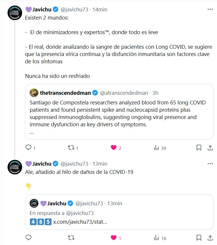 💜Javichu @javichu73 · Existen 2 mundos: – El de minimizadores y expertos™, donde todo es leve – El real, donde analizando la sangre de pacientes con Long COVID, se sugiere que la presencia vírica continua y la disfunción inmunitaria son factores clave de los síntomas Nunca ha sido un resfriado