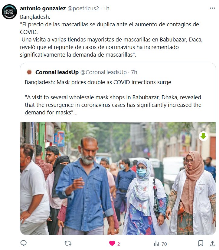Prof. Antonio González @poetricus2 · Bangladesh: «El precio de las mascarillas se duplica ante el aumento de contagios de COVID. Una visita a varias tiendas mayoristas de mascarillas en Babubazar, Daca, reveló que el repunte de casos de coronavirus ha incrementado significativamente la demanda de mascarillas»