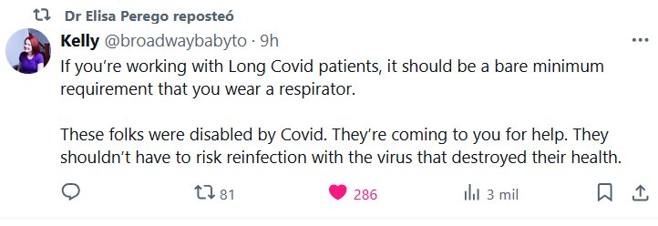 Dra Elisa Perego reposteó Kelly @broadwaybabyto Si trabaja con pacientes con Covid persistente, el uso de un respirador debería ser un requisito mínimo. Estas personas quedaron incapacitadas por la Covid. Acuden a usted en busca de ayuda. No deberían correr el riesgo de reinfectarse con el virus que destruyó su salud.