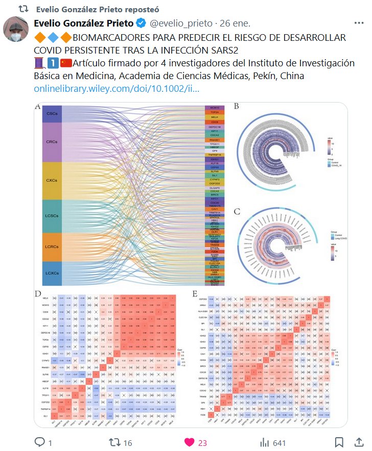 DR. Evelio González Prieto @evelio_prieto · 26 ene. 🔶🔷🔶BIOMARCADORES PARA PREDECIR EL RIESGO DE DESARROLLAR COVID PERSISTENTE TRAS LA INFECCIÓN SARS2 🧵1⃣🇨🇳Artículo firmado por 4 investigadores del Instituto de Investigación Básica en Medicina, Academia de Ciencias Médicas, Pekín, China