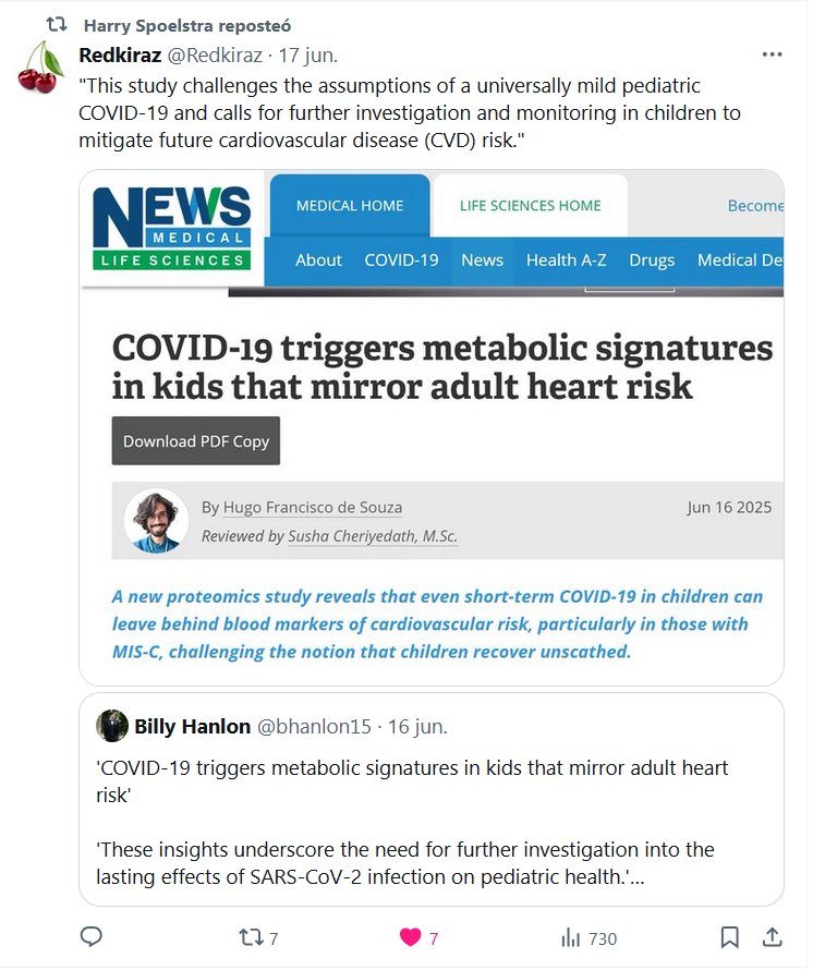 Dr. Harry Spoelstra reposteó a Redkiraz @Redkiraz «Este estudio desafía las suposiciones de que la COVID-19 pediátrica es generalmente leve y exige mayor investigación y seguimiento en niños para mitigar el riesgo futuro de enfermedad cardiovascular (ECV)»