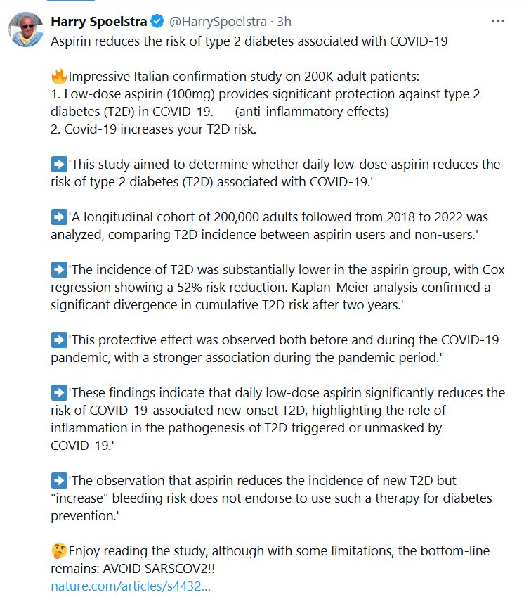 Aspirina reduce el riesgo de diabetes tipo 2 asociada con la COVID 🔥Impresionante estudio italiano de confirmación con 200.000 pacientes adultos: en dosis bajas (100 mg) proporciona una protección significativa contra la diabetes tipo 2 en la COVID (efectos antiinflamatorios).