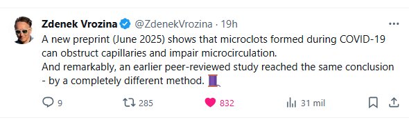 Zdenek Vrozina @ZdenekVrozina Una nueva preimpresión (junio de 2025) muestra que los microcoágulos formados durante la COVID-19 pueden obstruir los capilares y afectar la microcirculación. Y, sorprendentemente, un estudio previo revisado por pares llegó a la misma conclusión, utilizando un método completamente diferente.