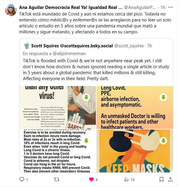 Ana Aguilar Democracia Real Ya! Igualdad Real Ya! @AnaAguilarPAC · TikTok está inundado de Covid y aún ni estamos cerca del pico. Todavía no entiendo cómo médic@s y enfermer@s se las arreglaron para no leer un solo artículo o estudio en 5 años sobre una pandemia mundial que mató a millones y sigue matando, y afectando a todos en su campo.