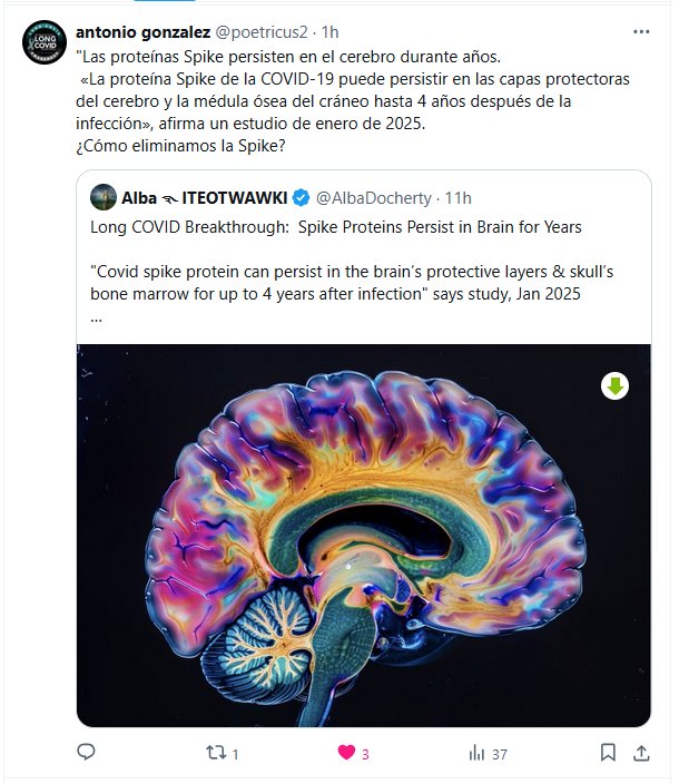 Prof. Antonio González @poetricus2 · «Las proteínas Spike persisten en el cerebro durante años. «La proteína Spike de la COVID-19 puede persistir en las capas protectoras del cerebro y la médula ósea del cráneo hasta 4 años después de la infección», afirma un estudio de enero de 2025. ¿Cómo eliminamos la Spike?