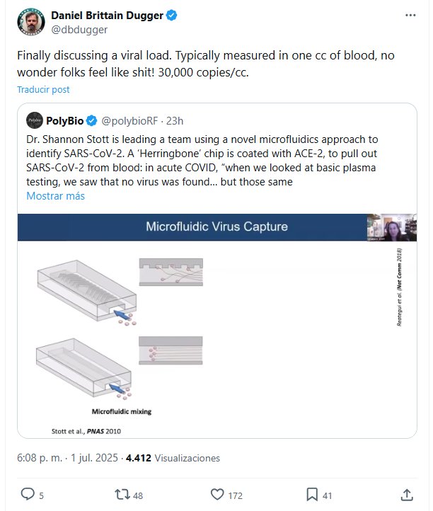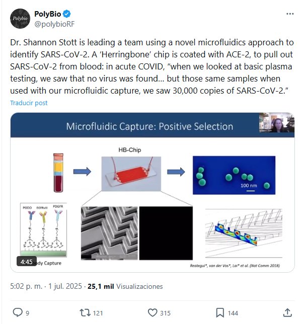 La Dra. Shannon Stott lidera un equipo que utiliza un novedoso enfoque de microfluidos para identificar el SARS-CoV-2. Un chip en forma de espiga está recubierto con ACE-2 para extraer el SARS-CoV-2 de la sangre: en casos de COVID aguda, «al analizar las pruebas básicas de plasma, no se encontró ningún virus... pero al utilizar esas mismas muestras con nuestra captura microfluídica, detectamos 30.000 copias de SARS-CoV-2».