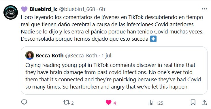ESCUCHO VOCES (QUE YA SON GRITOS) Lloro leyendo los comentarios de jóvenes en TikTok descubriendo en tiempo real que tienen daño cerebral a causa de las infecciones Covid anteriores. Nadie se lo dijo y les entra el pánico porque han tenido Covid muchas veces. Desconsolada porque hemos dejado que esto suceda