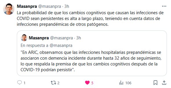 Masanpra @masanpra · La probabilidad de que los cambios cognitivos que causan las infecciones de COVID sean persistentes es alta a largo plazo, teniendo en cuenta datos de infecciones prepandémicas de otros patógenos.