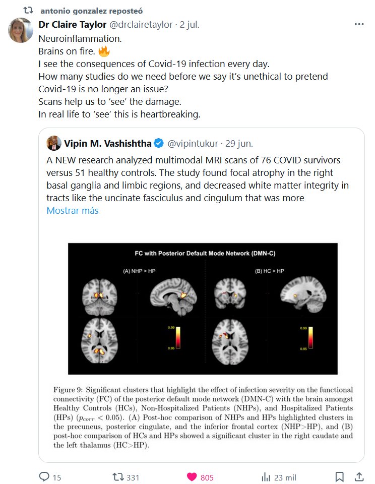 COVID Y CEREBRO Una nueva investigación analizó resonancias magnéticas multimodales de 76 sobrevivientes de COVID-19 frente a 51 controles sanos. El estudio encontró atrofia focal en los ganglios basales derechos y las regiones límbicas, así como una disminución de la integridad de la sustancia blanca