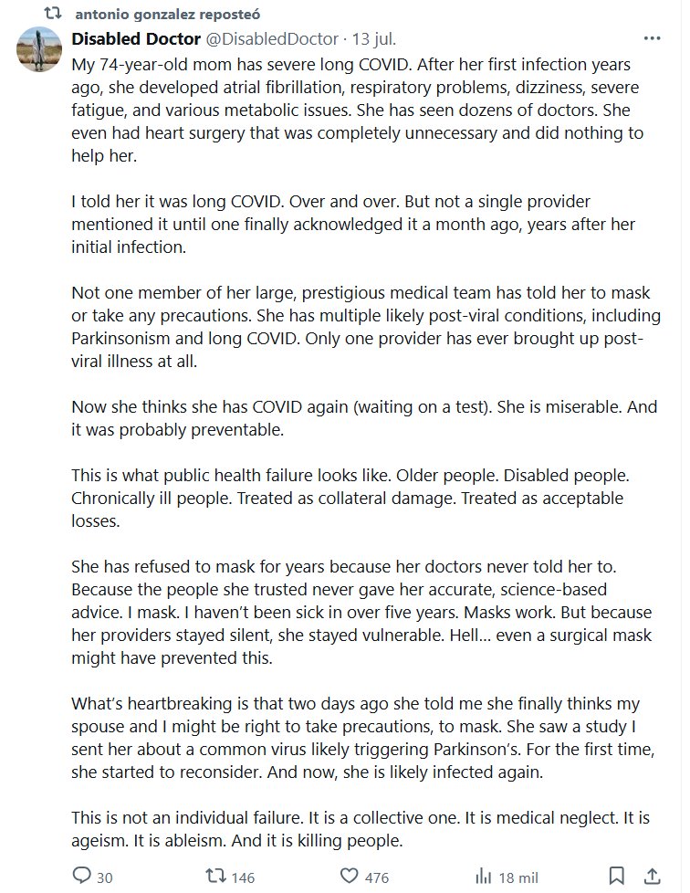 TESTIMONIOS Mi madre de 74 años tiene COVID-19 grave y persistente. Tras su primera infección hace años, desarrolló fibrilación auricular, problemas respiratorios, mareos, fatiga intensa y diversos problemas metabólicos. Ha consultado a decenas de médicos.