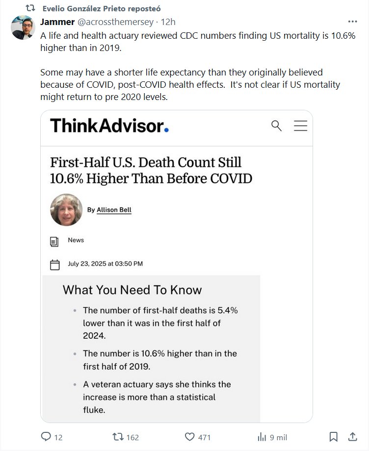 TODOS LO REPOSTEAN Y NADIE ESCUCHA! El Dr. Evelio González Prieto reposteó a Jammer en @acrossthemersey. Un actuario de vida y salud revisó las cifras de los CDC y descubrió que la mortalidad en EE. UU. es un 10,6 % mayor que en 2019. Es posible que algunas personas tengan una esperanza de vida más corta de lo que creían inicialmente debido a los efectos de la COVID-19 en la salud. No está claro si la mortalidad en EE. UU. podría volver a los niveles anteriores a 2020.
