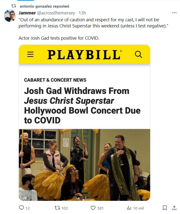 Jammer @acrossthemersey “Por precaución y respeto a mi elenco, no actuaré en Jesucristo Superstar este fin de semana (a menos que dé negativo)”. El actor Josh Gad dio positivo por COVID-19 Posted on julio 31, 2025 por coronado