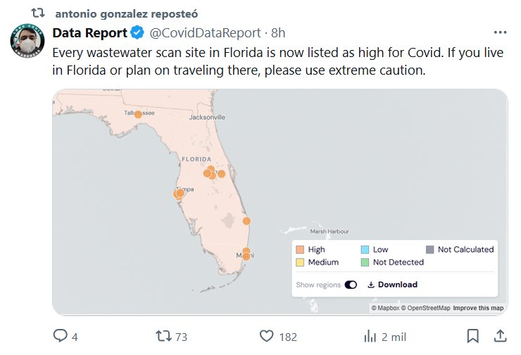 BITÁCORA DE AGOSTO DE 2025: 6º AÑO DE «FIN DE PANDEMIA» Informe de datos @CovidDataReport Todos los sitios de análisis de aguas residuales en Florida están clasificados como de alto riesgo de COVID-19. Si vive en Florida o planea viajar allí, tenga mucho cuidado.