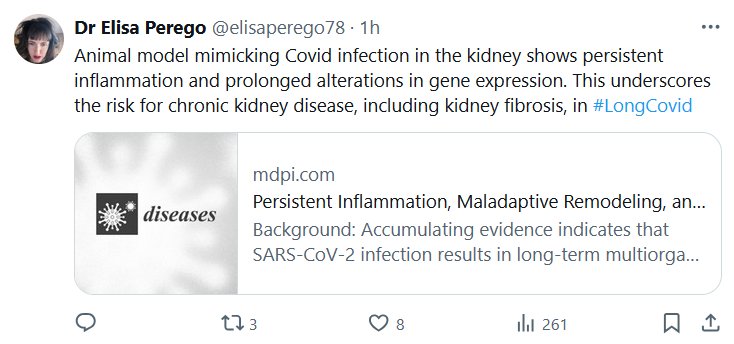 Dra. Elisa Perego @elisaperego78 Un modelo animal que simula la infección por COVID-19 en el riñón muestra inflamación persistente y alteraciones prolongadas en la expresión génica. Esto subraya el riesgo de enfermedad renal crónica, incluida la fibrosis renal, en pacientes con #CovidProlongado.