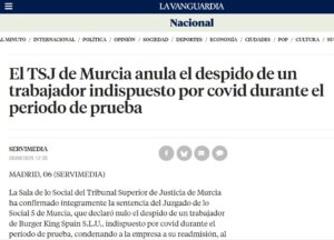 El TSJ de Murcia anula el despido de un trabajador indispuesto por covid durante el periodo de prueba Posted on agosto 6, 2025 por coronado https://www.lavanguardia.com/nacional/20250806/10955276/tsj-murcia-anula-despido-trabajador-indispuesto-covid-periodo-prueba-agenciaslv20250806.html