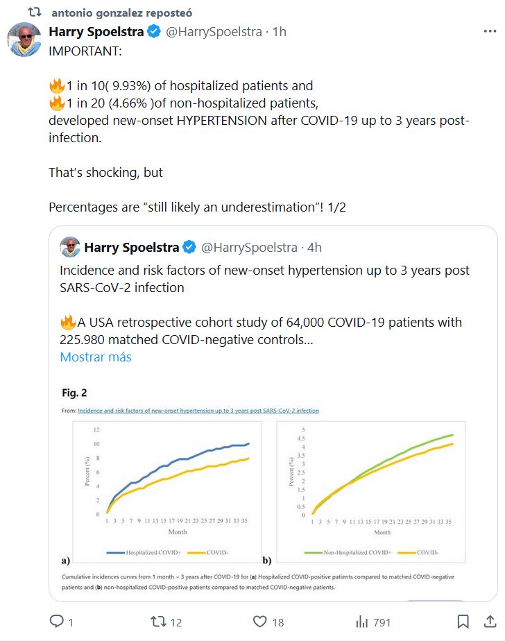 El Prof. Antonio González reportó al Dr. Harry Spoelstra @HarrySpoelstra IMPORTANTE: 🔥1 de cada 10 (9,93 %) de los pacientes hospitalizados y 🔥1 de cada 20 (4,66 %) de los pacientes no hospitalizados, desarrollaron hipertensión de nueva aparición después de la COVID-19 hasta 3 años después de la infección. Es sorprendente, pero ¡los porcentajes probablemente siguen siendo una subestimación!