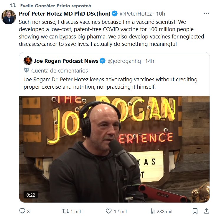ESCUCHO VOCES Dr. Evelio González Prieto reposteó Prof Peter Hotez MD PhD DSc(hon) @PeterHotez Such nonsense, I discuss vaccines because I’m a vaccine scientist. We developed a low-cost, patent-free COVID vaccine for 100 million people showing we can bypass big pharma. We also develop vaccines for neglected diseases/cancer to save lives. I actually do something meaningful