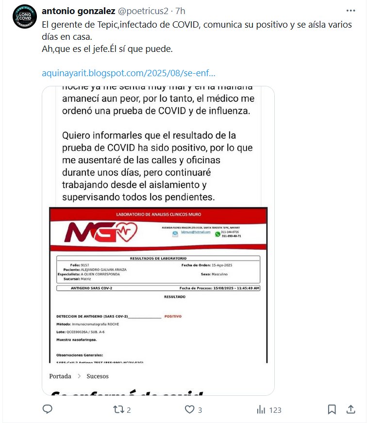 TESTIMONIOS: OBLIGAN A TRABAJAR Y CONTAGIAR CON COVID? Prof. Antonio González @poetricus2 · El gerente de Tepic,infectado de COVID, comunica su positivo y se aísla varios días en casa. Ah, que es el jefe. Él sí que puede.