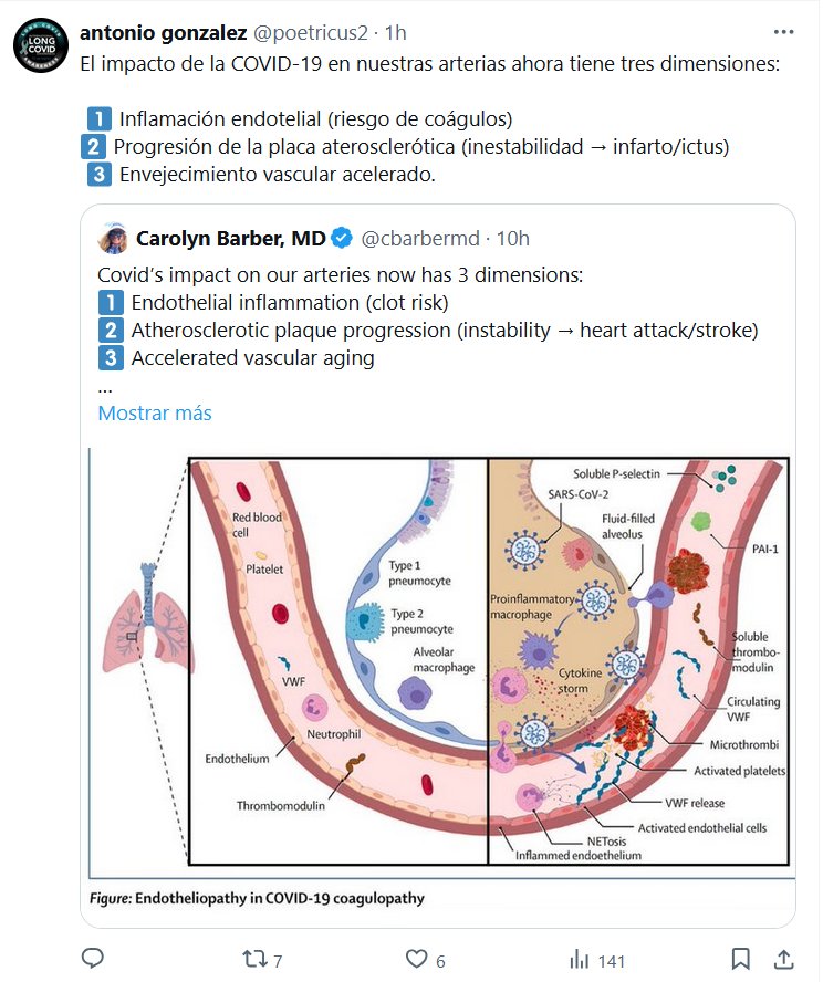 Prof. Antonio González @poetricus2 · El impacto de la COVID-19 en nuestras arterias ahora tiene tres dimensiones: 1️⃣ Inflamación endotelial (riesgo de coágulos) 2️⃣ Progresión de la placa aterosclerótica (inestabilidad → infarto/ictus) 3️⃣ Envejecimiento vascular acelerado.
