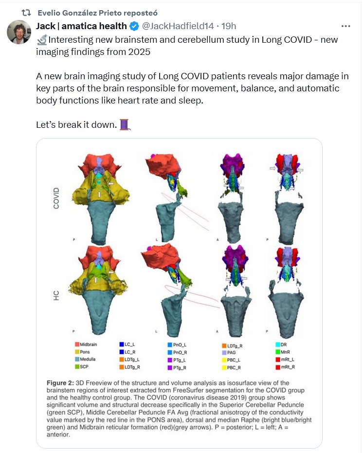 Dr. Evelio González Prieto reposteó a Jack | amatica health @JackHadfield14 🔬Nuevo e interesante estudio del tronco encefálico y el cerebelo en pacientes con COVID persistente: nuevos hallazgos de imágenes de 2025 Un nuevo estudio de imágenes cerebrales en pacientes con COVID persistente revela daños importantes en partes clave del cerebro responsables del movimiento, el equilibrio y funciones corporales automáticas como la frecuencia cardíaca y el sueño.